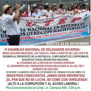 Realizada la Consulta sobre el Paro Nacional del SUTEP para el 24 de noviembre, de acuerdo al informe de las Bases Regionales en las que, en su mayoría, no han existido condiciones para esta medida consultada, se acuerda realizar una MOVILIZACIÓN NACIONAL el día MARTES 29 DE NOVIEMBRE, para exigir al Presidente Kuczynski el cumplimiento de su compromiso con los maestros y al Congreso de la República la aprobación de un Presupuesto no menor del 8% del PBI para Educación, que permita incrementar el piso salarial de los maestros y la alimentación y salud de los escolares.