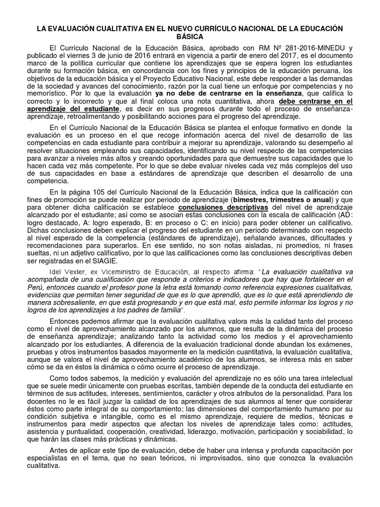 | En el Currículo Nacional de la Educación Básica se plantea el enfoque formativo en donde la evaluación es un proceso en el que recoge información acerca del nivel de desarrollo de las competencias en cada estudiante para contribuir a mejorar su aprendizaje, valorando su desempeño al resolver situaciones empleando sus capacidades, identificando su nivel respecto de las competencias para avanzar a niveles más altos y creando oportunidades para que demuestre sus capacidades que lo hacen cada vez más competente. Por lo que se debe evaluar niveles cada vez más complejos del uso de sus capacidades en base a estándares de aprendizaje que describen el desarrollo de una competencia. | ||