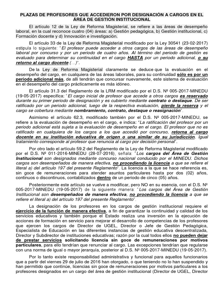 | La designación de los profesores en los cargos de gestión institucional requiere el ejercicio de la función de manera efectiva, razón por la cual todos ellos no pueden dejar de prestar servicios solicitando licencia sin goce de remuneraciones por motivos particulares, para ello tendrían que renunciar al cargo. Las excepciones tendrían que regularse con una norma de igual o mayor jerarquía, posterior al D.S. Nº 005-2017-MINEDU (19·05·2017). | ||